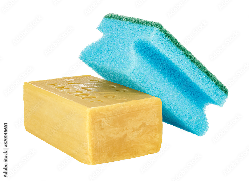 Lying yellow household soap with blue sponge for washing dishes on top isolated on white background