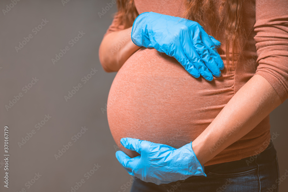 Pregnant Woman in blue gloves against flu and viruses. Healthcare concept. Pregnancy And Infection concept.