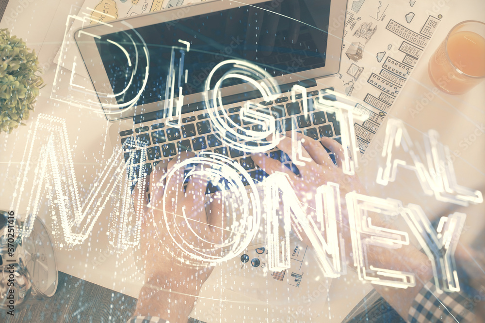 Double exposure of man's hands typing over computer keyboard and crypto currency theme hologram drawing. Top view. Blockchain concept.