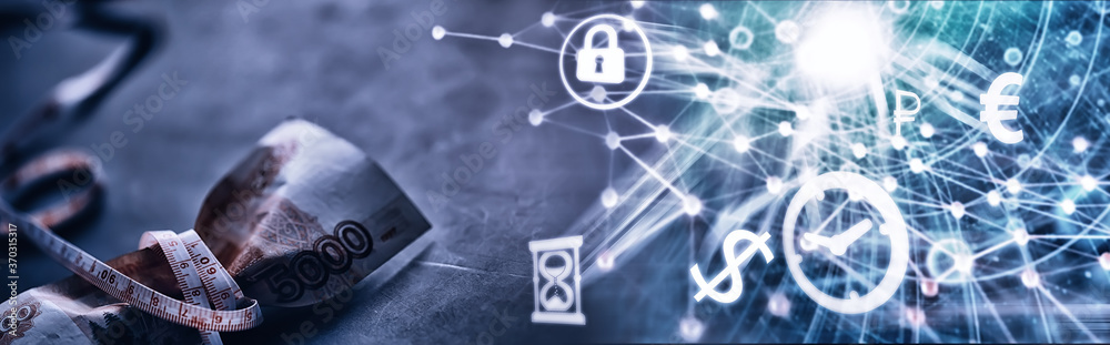Business concept. The depreciation of the national currency. Bill with the inscription "5000 thousand rubles". Inflation and stagnation. Tighten russian bill with measuring chain.
