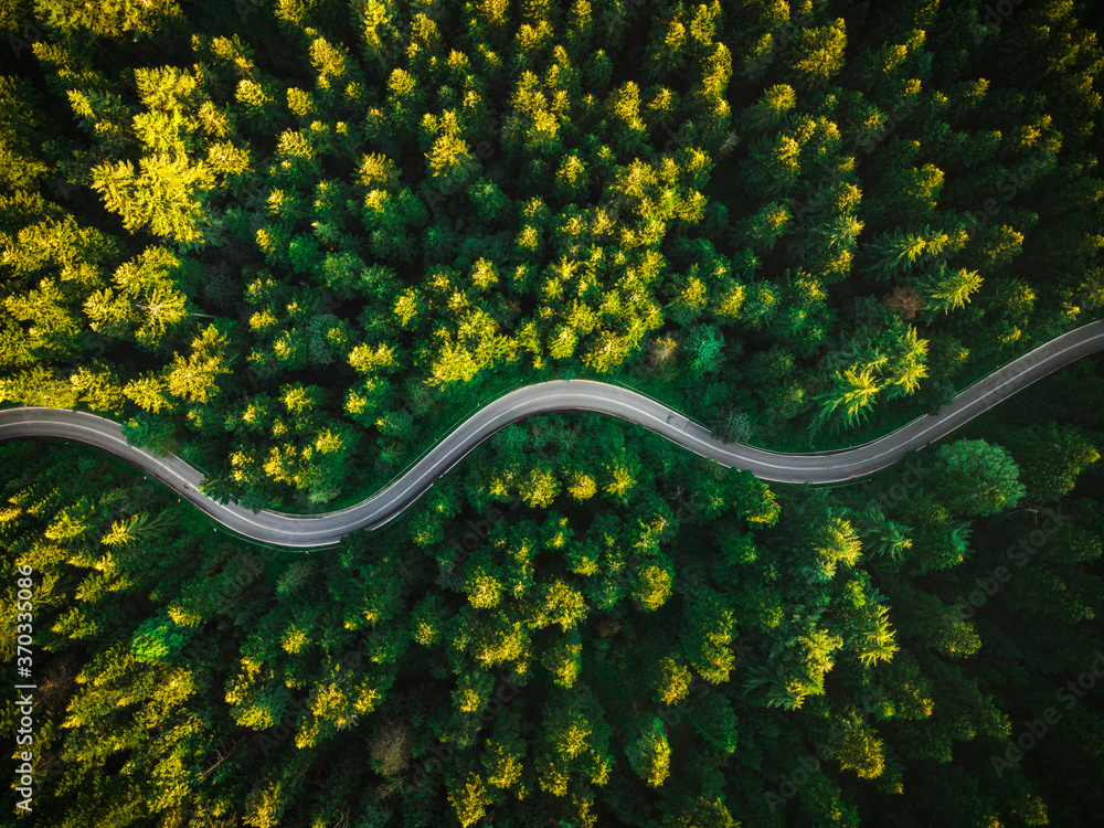 Curvy Road in Summer Pine Forest. top Down Drone Photography. Outdoor Wilderness