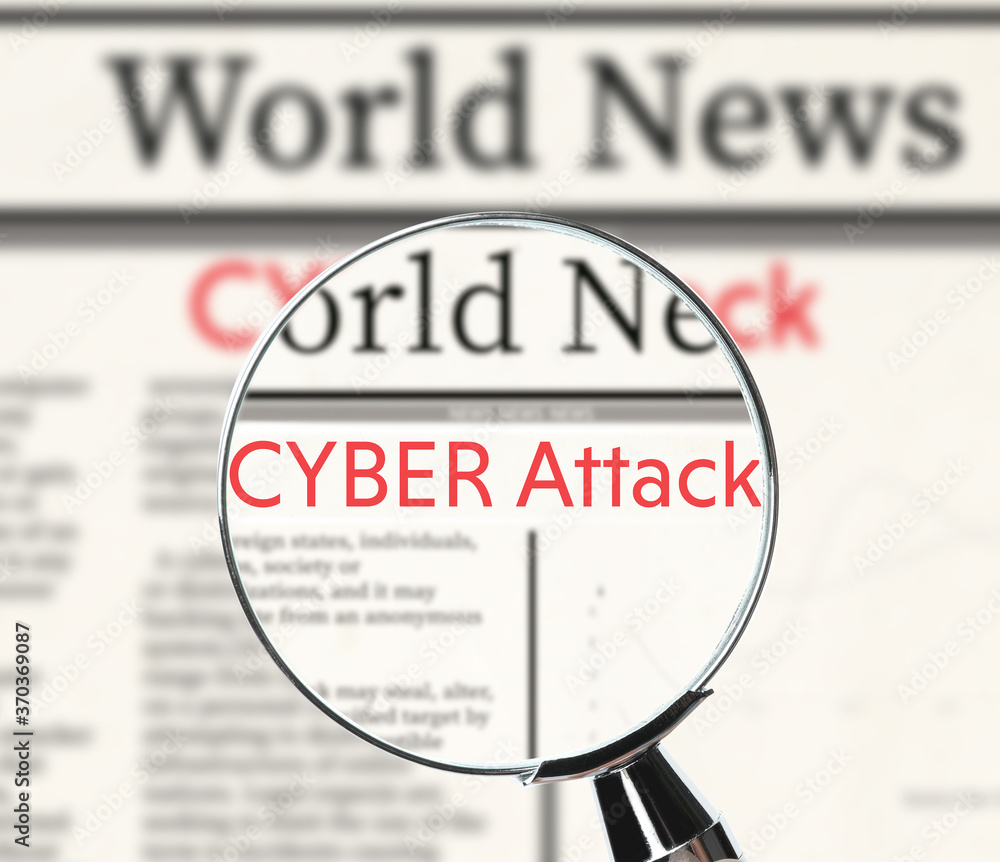Newspaper with headline CYBER ATTACK under magnifying glass, closeup