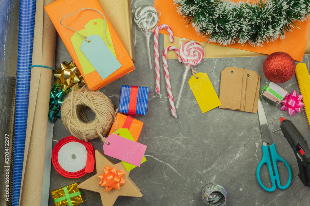 Gift wrapping in gift paper, top view