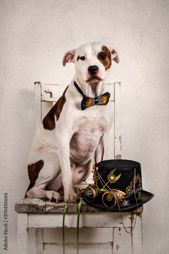 Dog Sitting on an Old Chair Wearing a Peacock Feather Bow Tie in Background a Steampunk Tophat