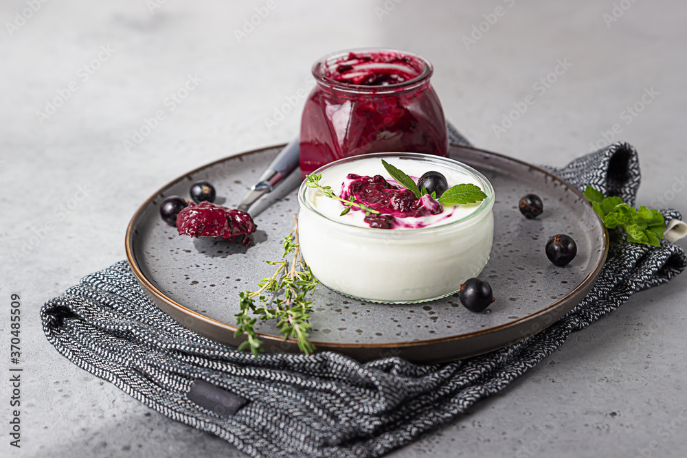 Jar of delicious homemade black currant curd, custard or jam with natural yogurt and fresh berries on grey background. Healthy breakfast.