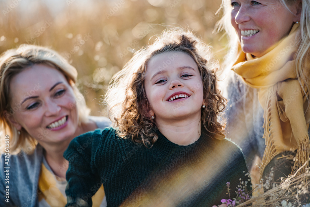 Portrait of small girl with mother and grandmother resting in autumn nature.