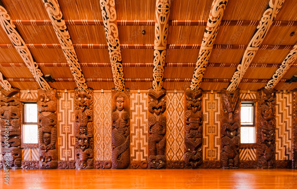 Interior of Maori meeting house in Waitangi, New Zealand