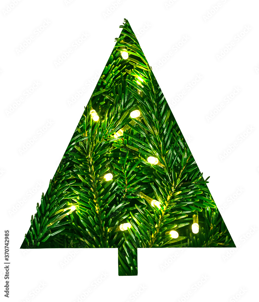 Tannenbaum ausgeschnitten aus weißer Pappe mit Tannenzweigen und Lichterkette