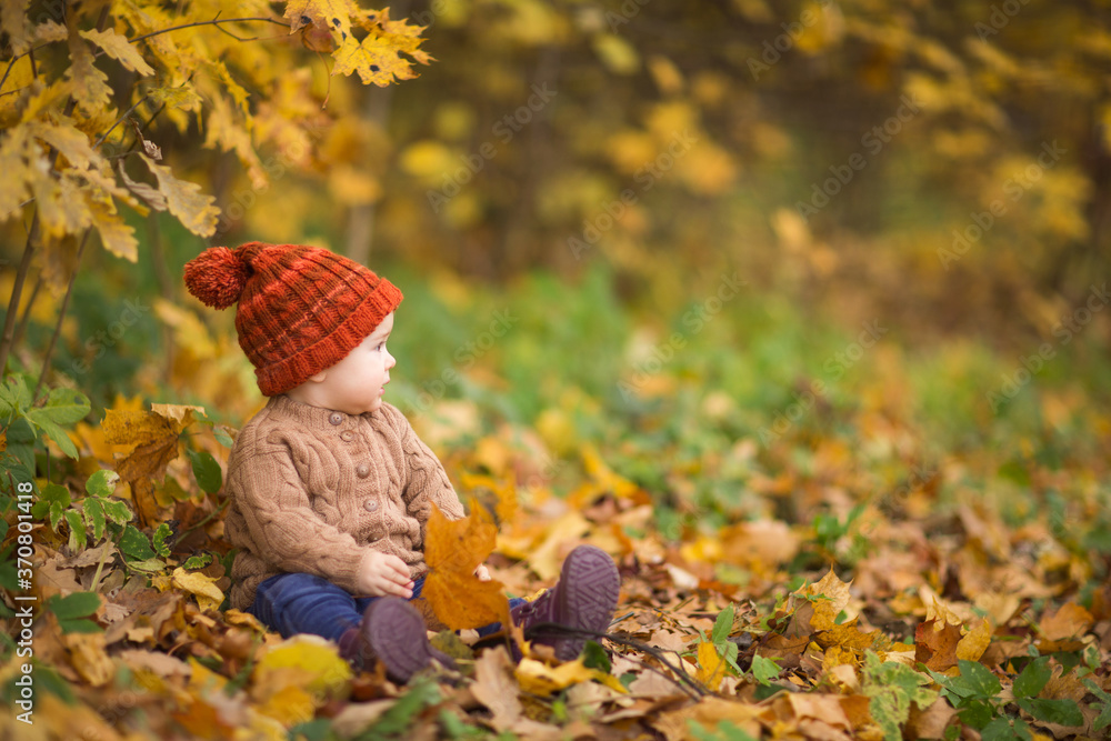 baby in knitted hat and jacket sits on grass in Park against background of autumn trees. children's clothing. walk outdoor