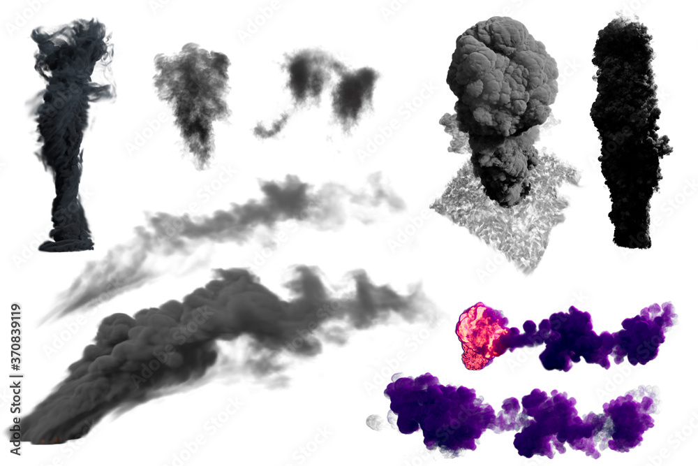 Black smoke with fire, dark fog clouds. Industrial smog, air pollution isolated background, Realistic 3d render set