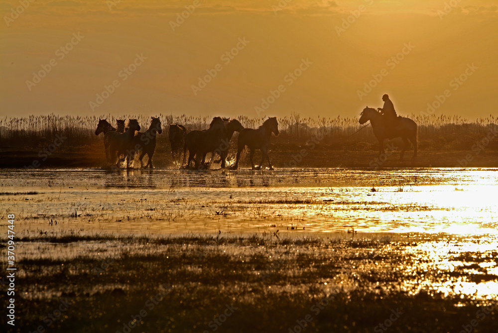 Camargue white horses galloping in a marsh at sunset, Bouches du Rhône, France