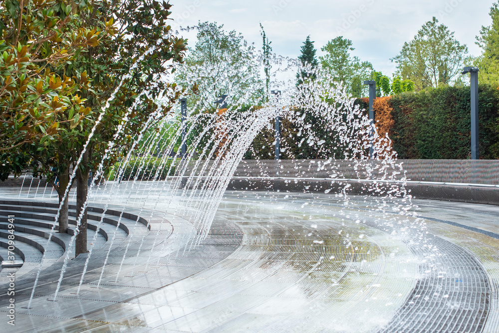 beautiful fountain in Krasnodar. you can pass under the arc of water. a splash cascade forms a passage. people walk