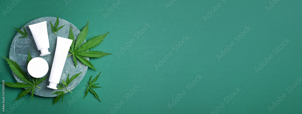 Hemp cosmetic products white bottles with oil, hemp seed extract, cream and cannabis leaves on green background. Flat lay. Top view. Copy space. Natural skin care and body treatment