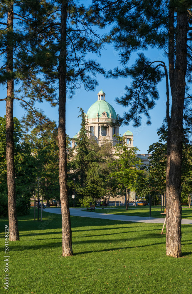 National Assembly of the Republic of Serbia (Skupstina) house, construction lasted until 1936) view from summer Pionirski park in the center of city of Belgrade, Serbia, Europe. People unrecognizable.