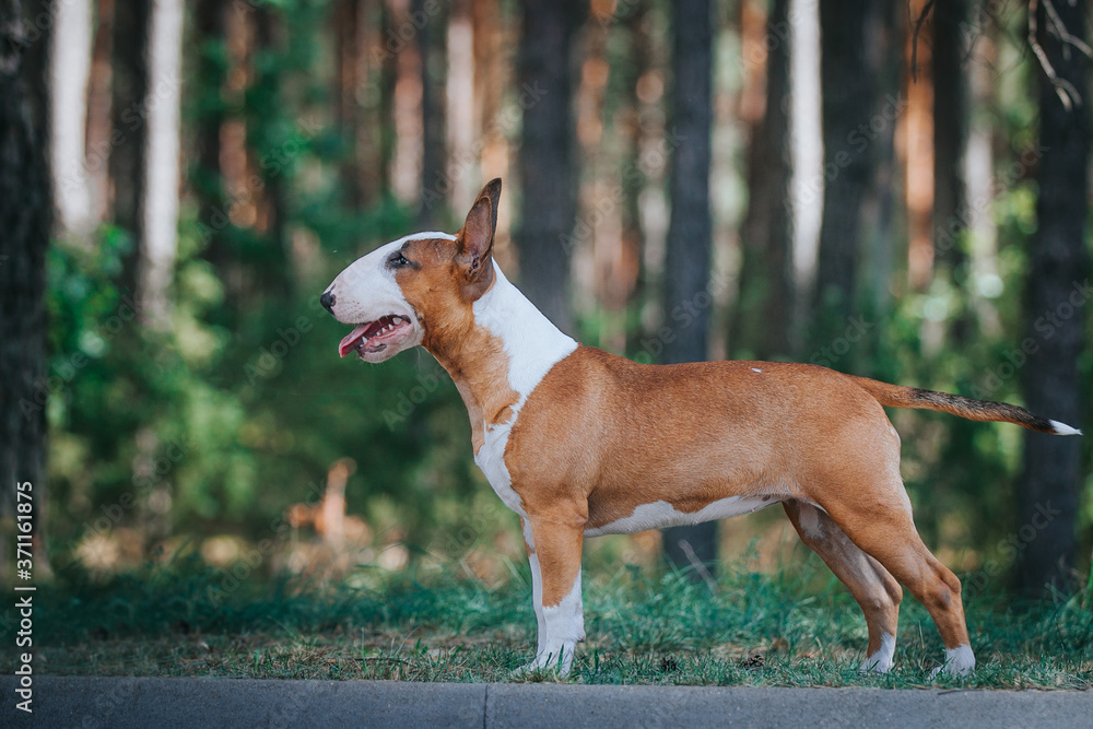 Bull terrier show dog posing outside. Red bullterrier male. Strong dog.