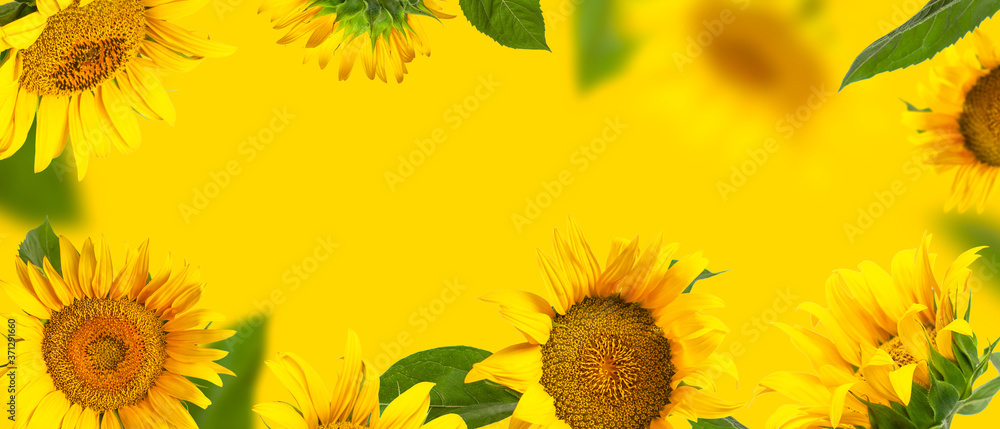 Creative background with flying yellow sunflowers, green leaves Flat lay. Frame from beautiful sunflowers floral card. Template for design. Harvest time agriculture farming Sunflower yellow background