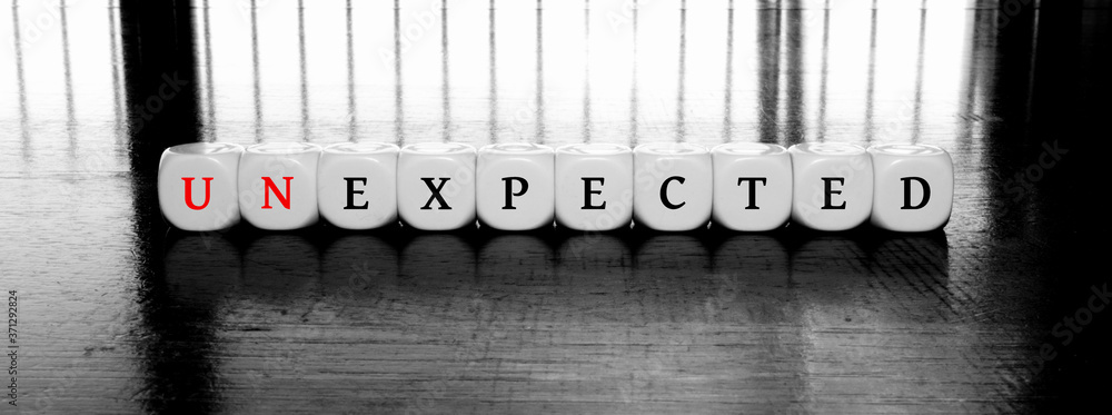 dices with letters forming word "expected" or "unexpected" on a black and white background