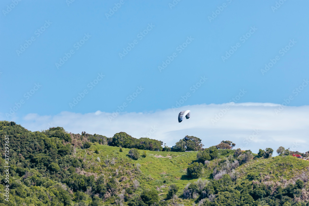 Paraglider landing on hills of Bay of Islands, New Zealand