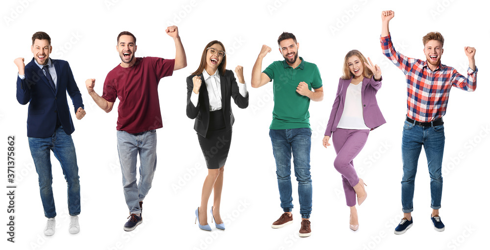 Collage with photos of happy people celebrating victory on white background. Banner design