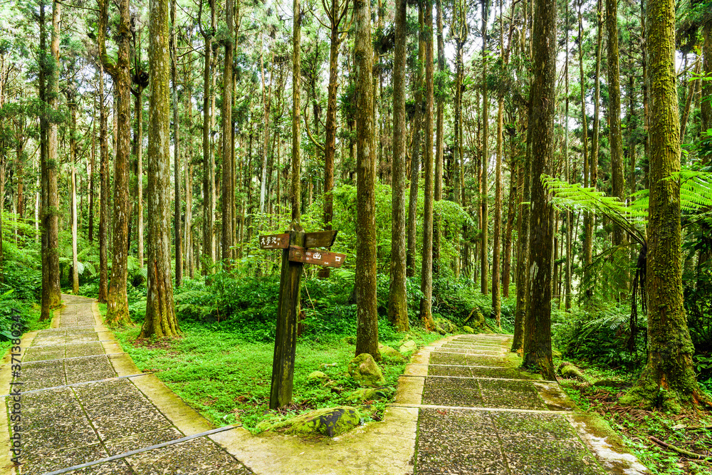 View of the footpath through the forest in Xitou Nature Education Area in Nantou, Taiwan.