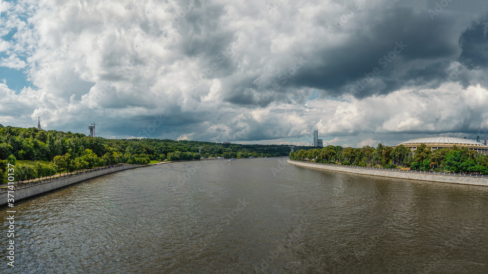Wide panoramic view of the Moscow river and Sparrow hills. Moscow. Russia
