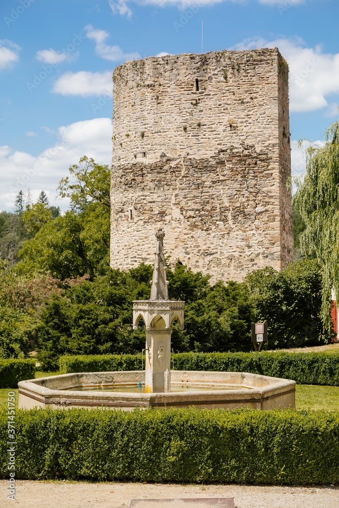 Fountain in the courtyard of the castle and a fragment of a stone wall. Castle Bitov, South Moravia Region, Czech Republic
