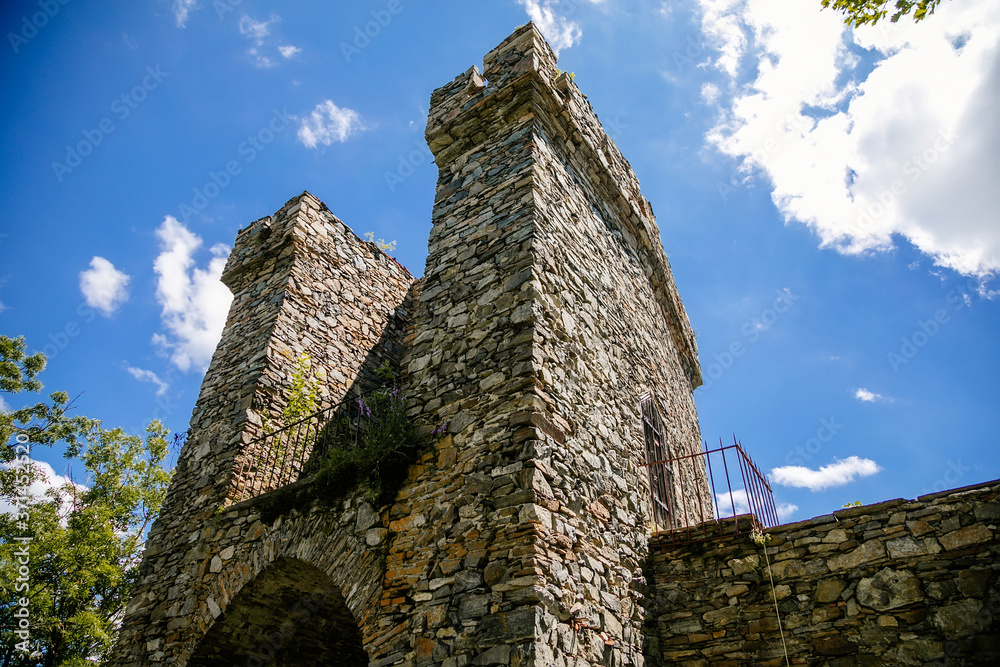 Stone walls with battlements, Castle Bitov, South Moravia Region, Czech Republic