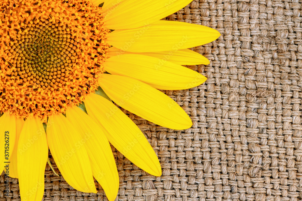 sunflower on burlap close-up, summer background, homespun texture, place for text, blank for design