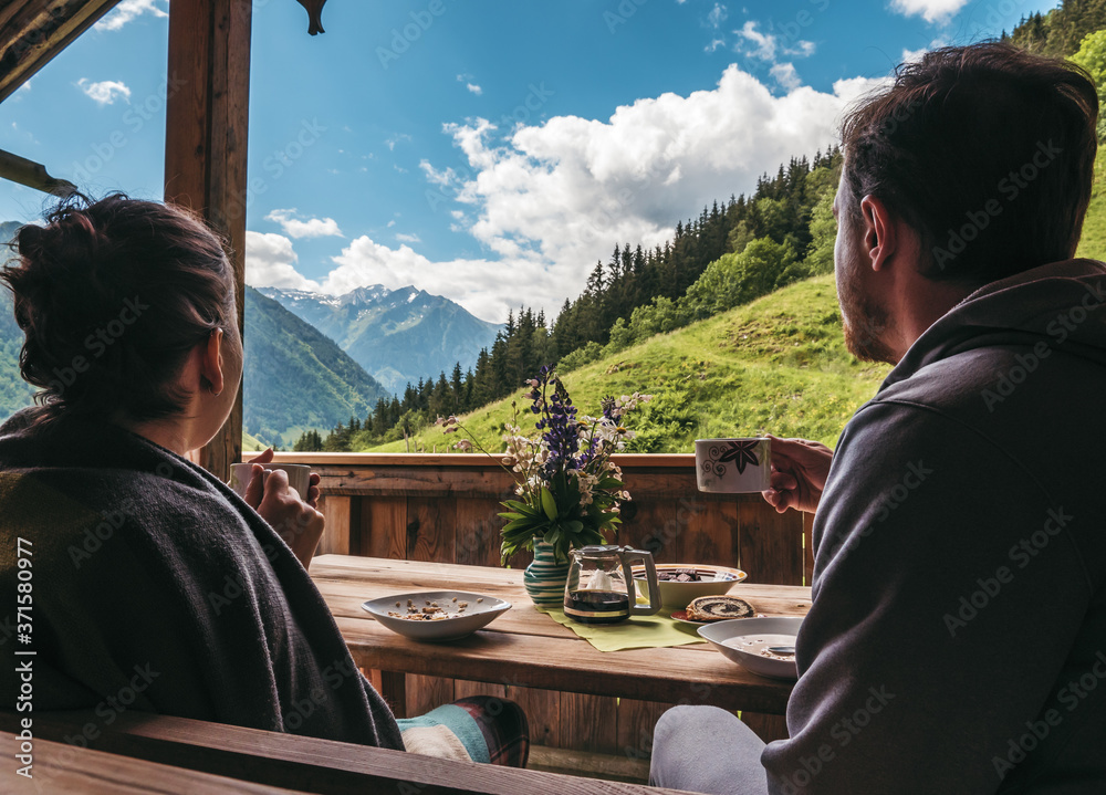 Couple sitting outside of a mountain hut, eating breakfast and enjoying the scenery