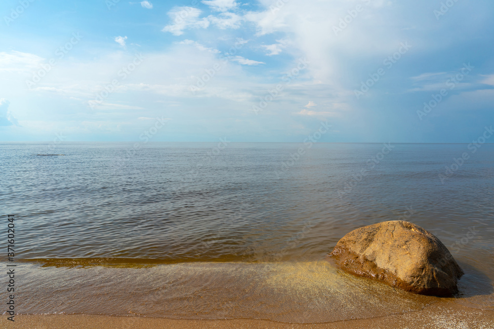 White clouds in the blue sky over the lake. Atmospheric natural background.