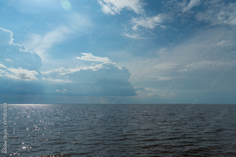 White clouds in the blue sky over the lake. Atmospheric natural background.