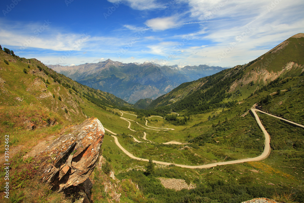 Unpaved road in the valley in Alps, italy.
