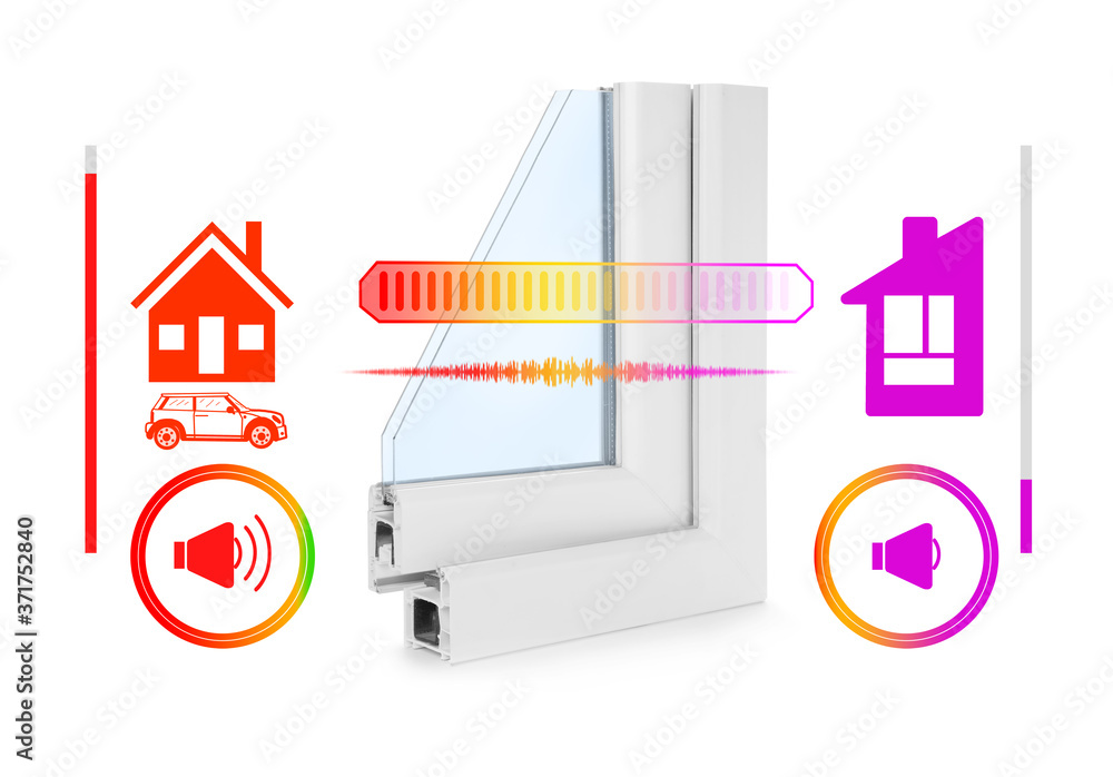 Window profile sample and illustrations on white background demonstrating noise cancelling effect