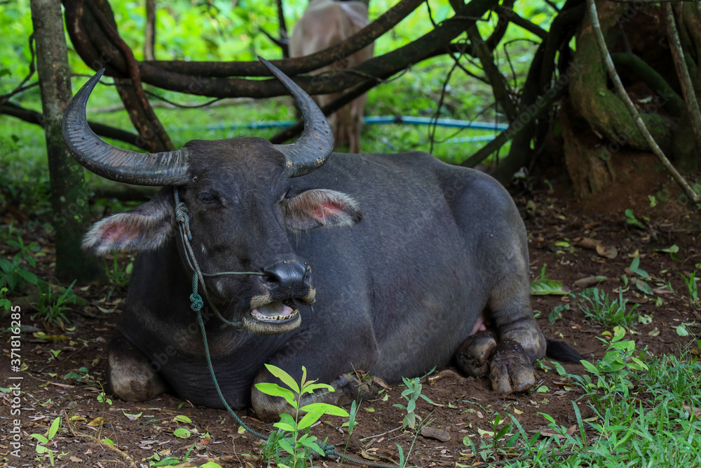 The buffalo is rest under the tree at garden in thailand