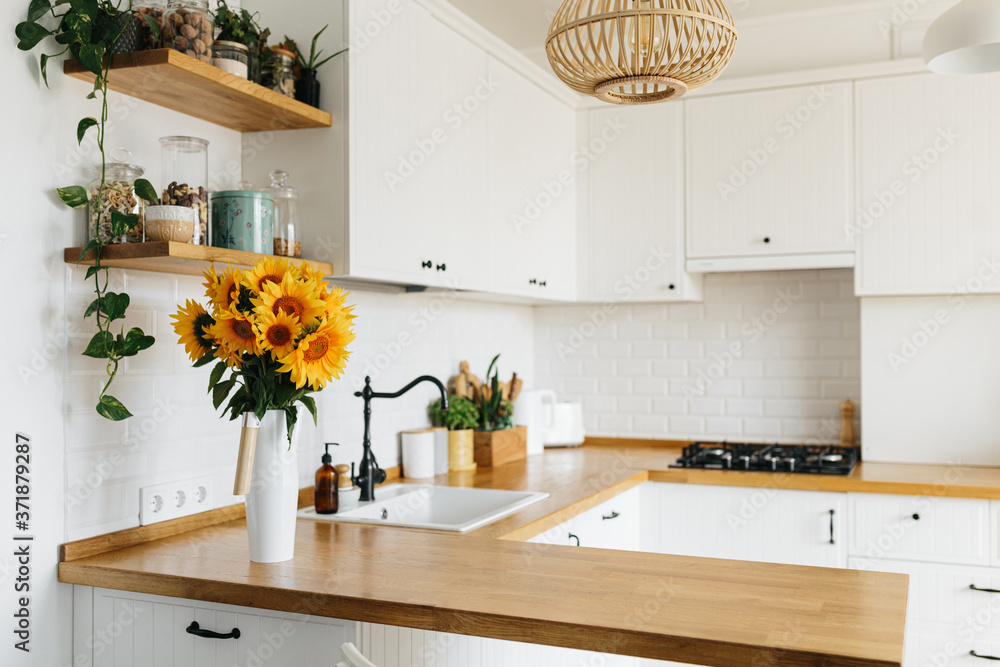 sunflowers bouquet in vase on the kitchen. View on white simple modern kitchen in scandinavian style