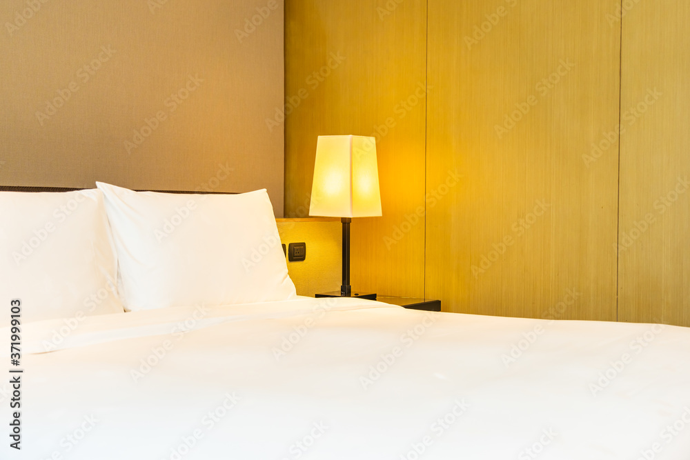 White comfortable pillow and blanket on bed with light lamp