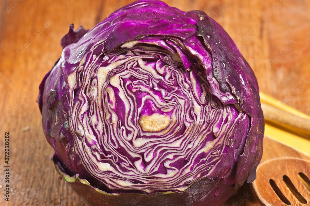 top view, close up of a head of red cabbage with top sliced off reveling a patter of purple and white rings of cabbage leaves, with wood spoons, on a wood cutting board