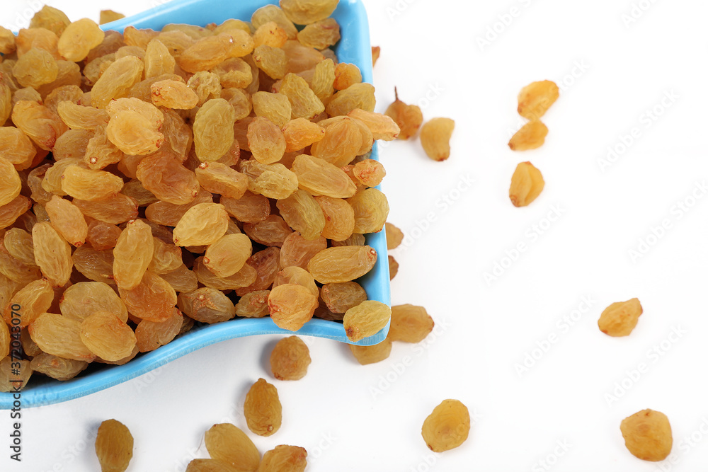 Bowl with dried golden raisins isolated on white. Dried Grapes.