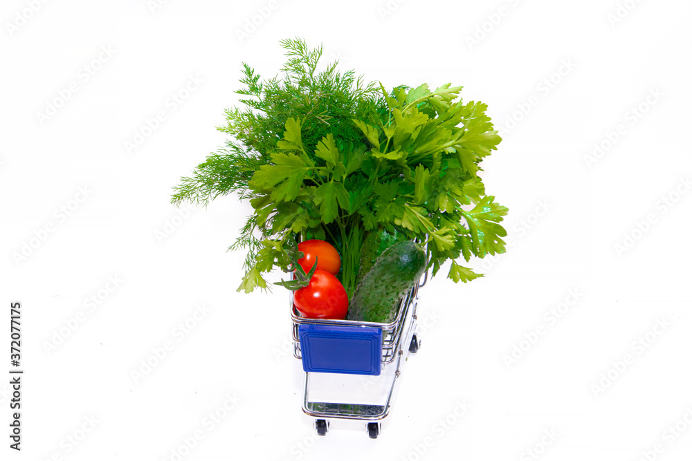 Cart with vegetables and herbs . Buying vegetables. Vegetarianism. Online purchases. Order products online. Coronavirus. Article about the benefits and harm of vegetables. Products for vegetable salad