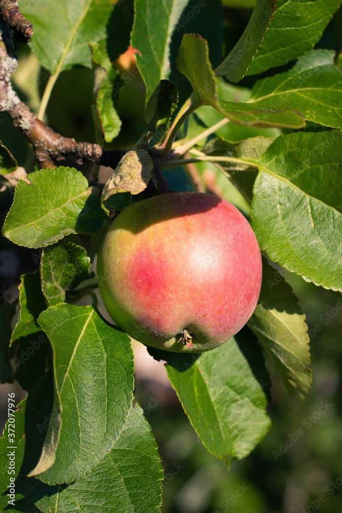 Red garden Apple on a branch . Harvest. Apple saved. A red Apple hangs on a branch. Copy space