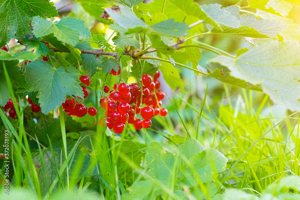A branch of red currant . Red berry. Harvest. Summer red berries . . A currant branch hangs over the greenery. Copy space