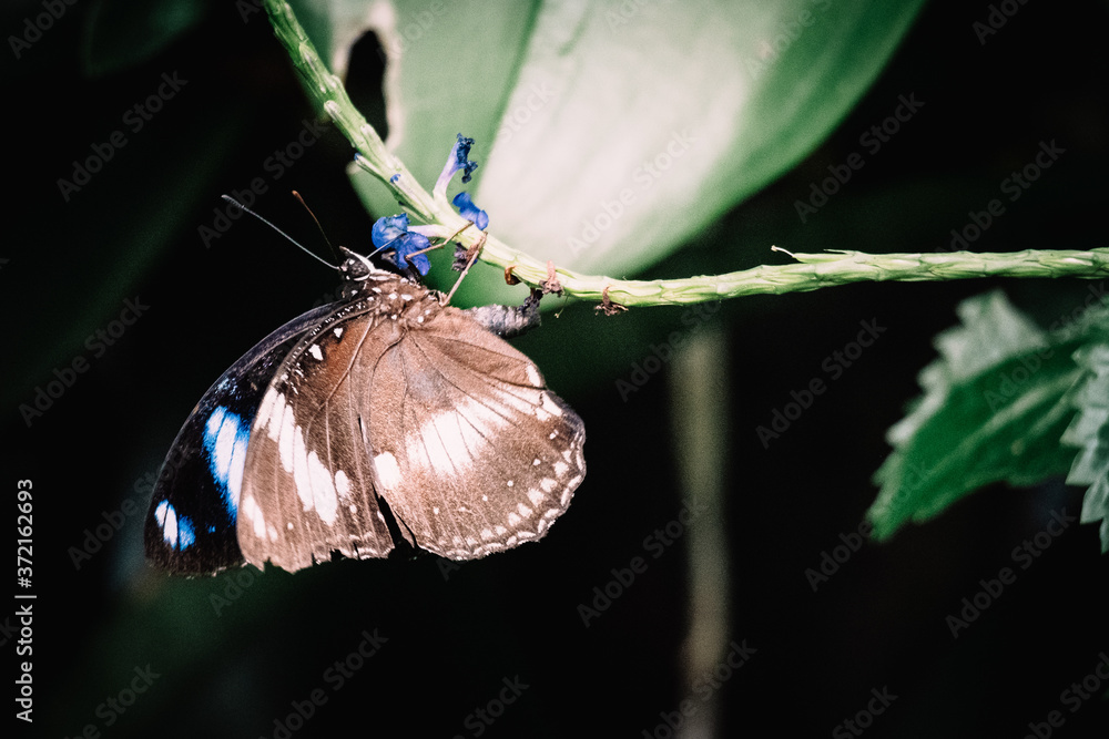 Der tropische Schmetterling "Gewöhnliche Eierfliege" (Hypolimnas bolina) an einer blauen Blüte hängend im Schmetterlingshaus