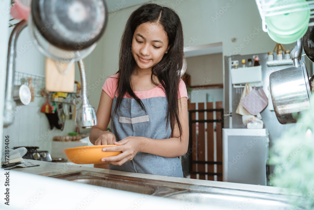teenage girls happily do the household chores washing dishes doing activities during the pandemic at home