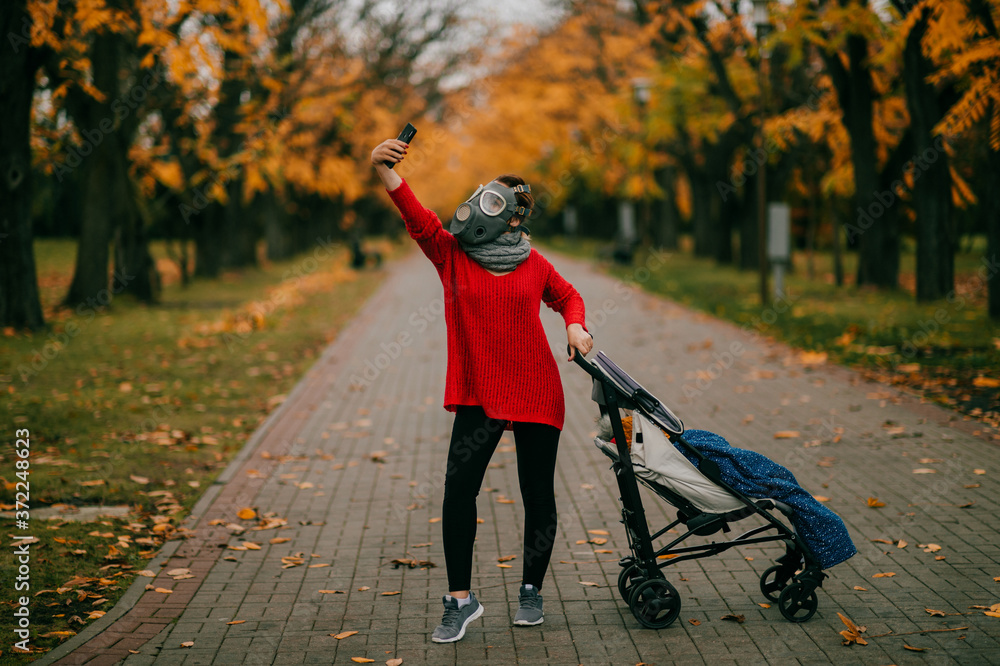 A beautiful tall woman in a red jacket and black pants with a gas mask on her head went for a walk with a child in a pram