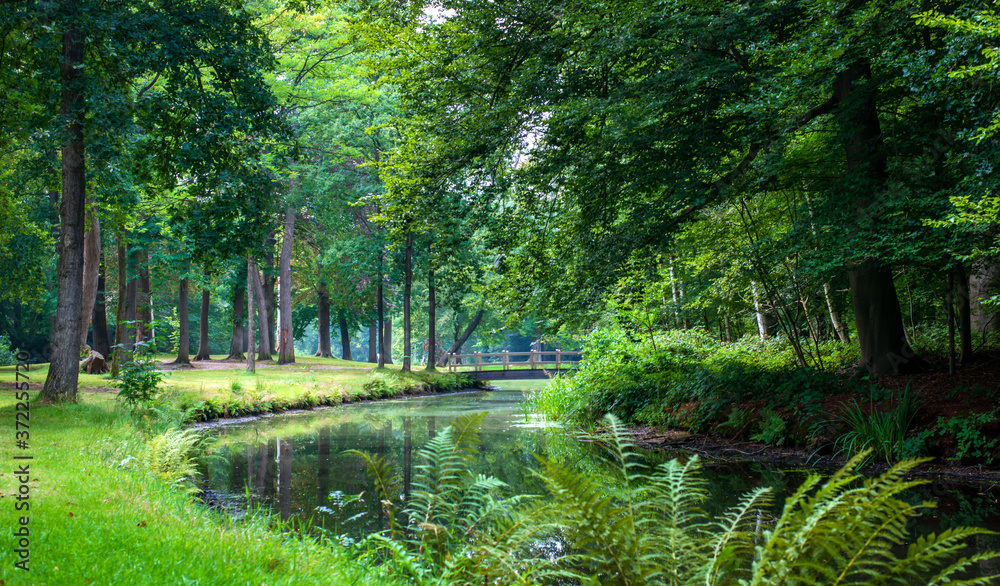 Beautiful green path in the forest spring nature in Europe, the bridge over the river landscape