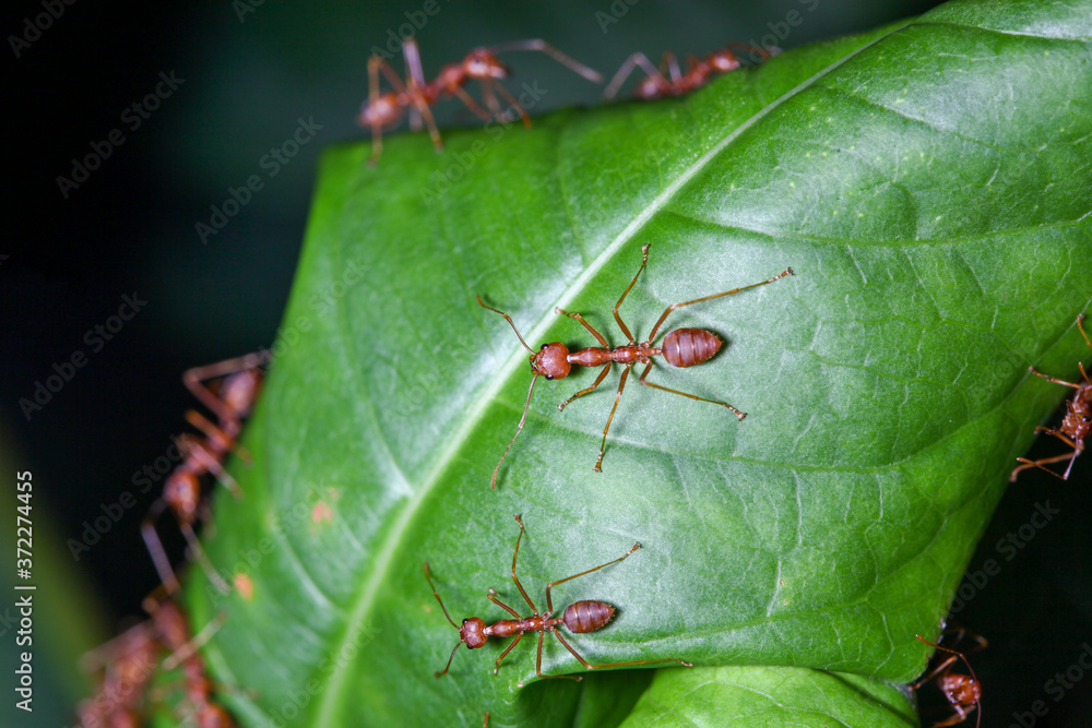 Close up red ant on green leaf in nature at thailand
