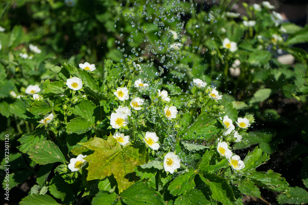 .Strawberries grow from the ground in the vegetable garden. Watering a bush of berries in the garden Growing vegetables, fruits and herbs. Gardening