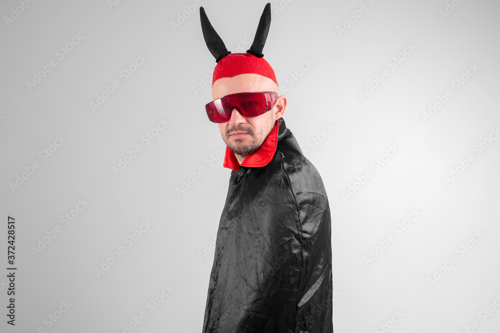 Strange devilish man in sunglasses and black red halloween costume posing over white background.