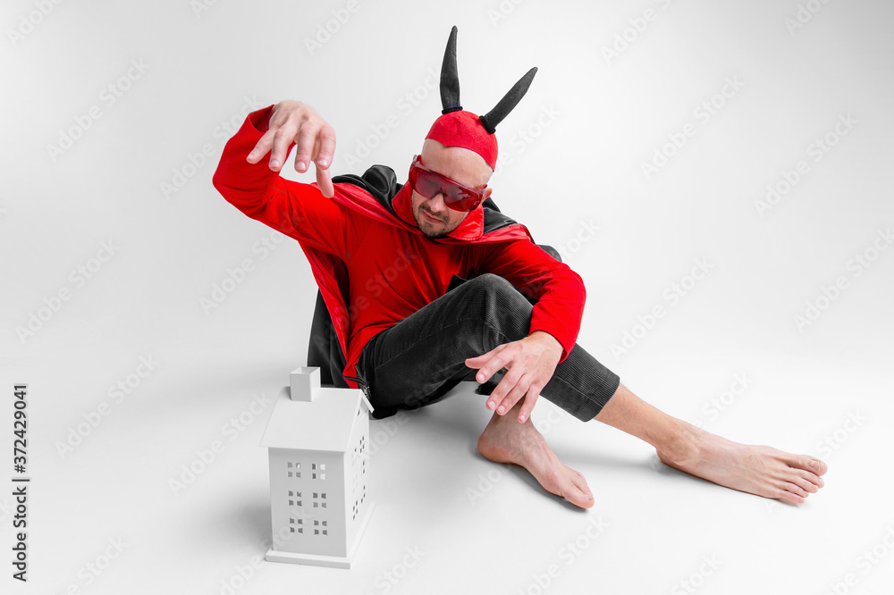 Young man in halloween devil cape and sunglasses with decorative building over white background.