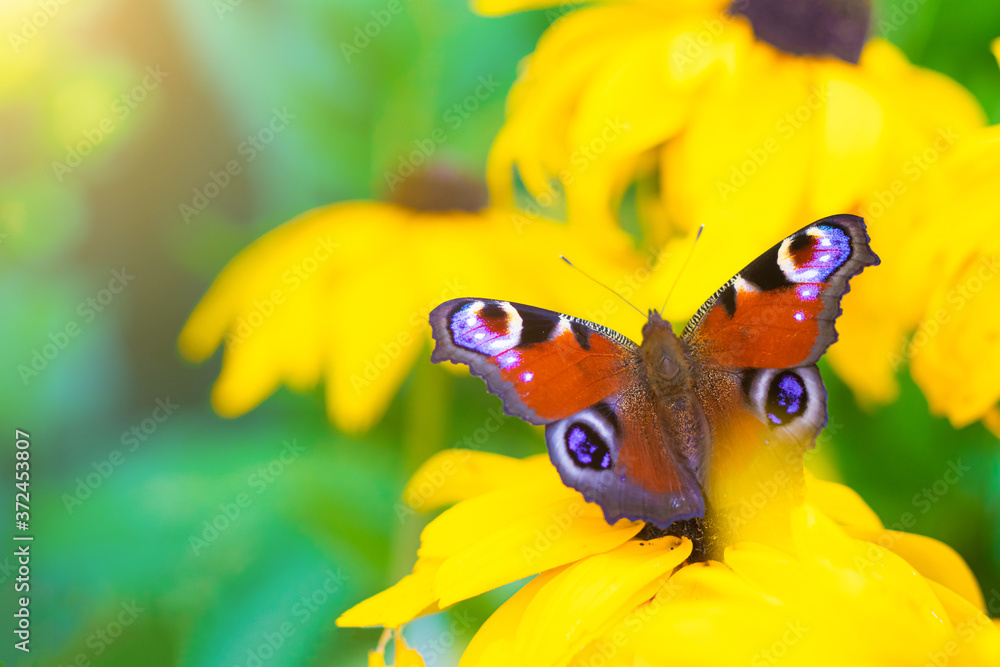 The urticaria butterfly sits on a yellow flower . beautiful butterfly. Insect . Insect on a flower. Butterfly on a flower.